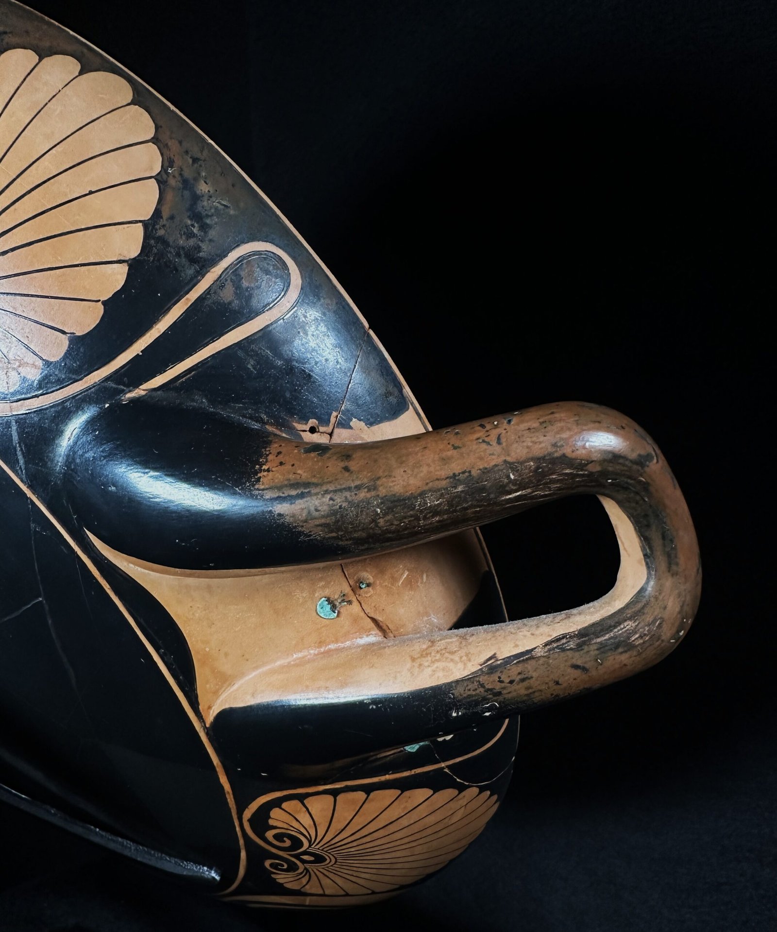 An ancient Attic Greek bilingual eye cup by Oltos; the tondo black-figured, with a cloaked youth walking right and looking back, holding an aulos and a cup; the exterior red-figured, each side with large abstract eyes flanked by palmettes; one side with a Nereid, likely Thetis, walking to the right, holding a small dolphin by the tail; the other with a small nose between the eyes, an ancient riveted bronze repair to the lip.
