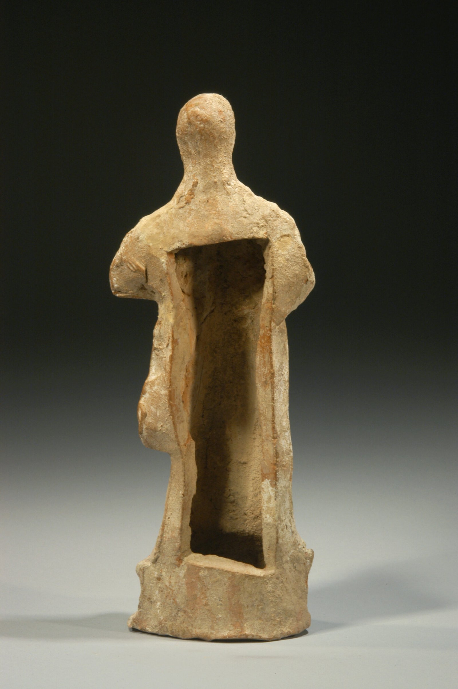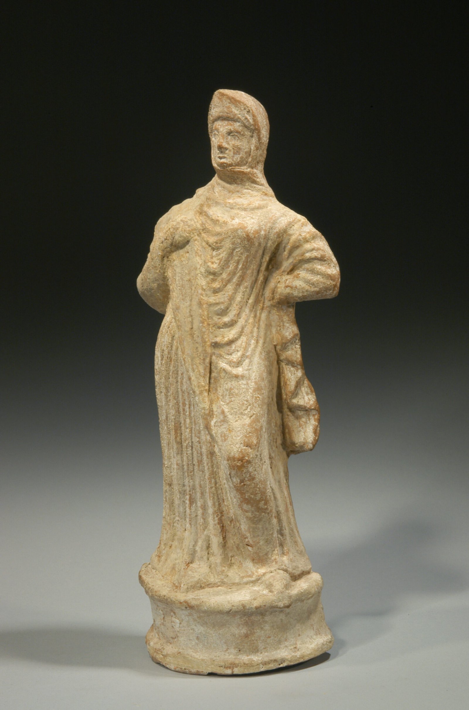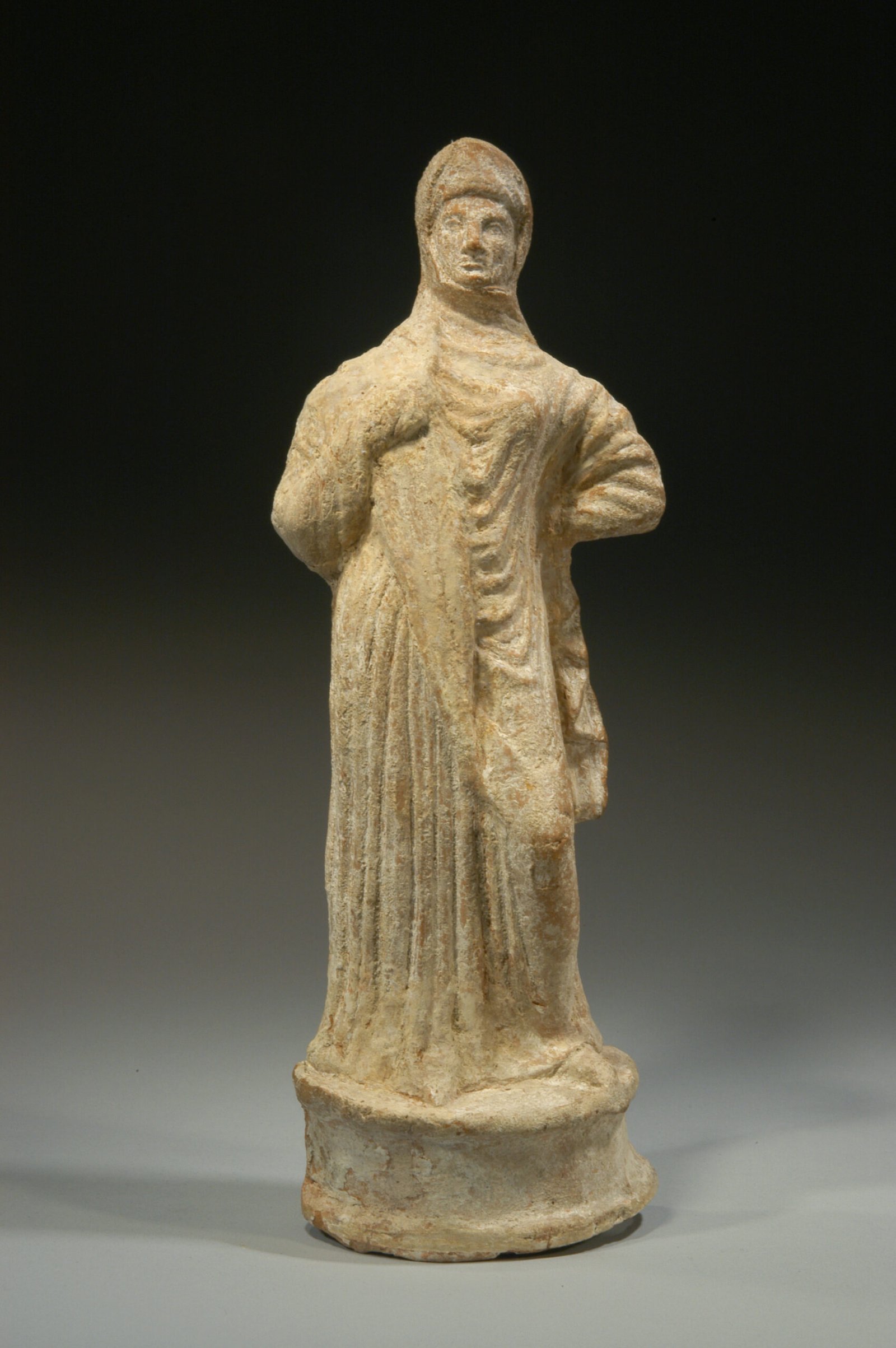 An ancient Hellenistic Greek terracotta figure of a standing young woman dressed in a voluminous himation wrapped around her body and pulled up over her head, on an integral round plinth.