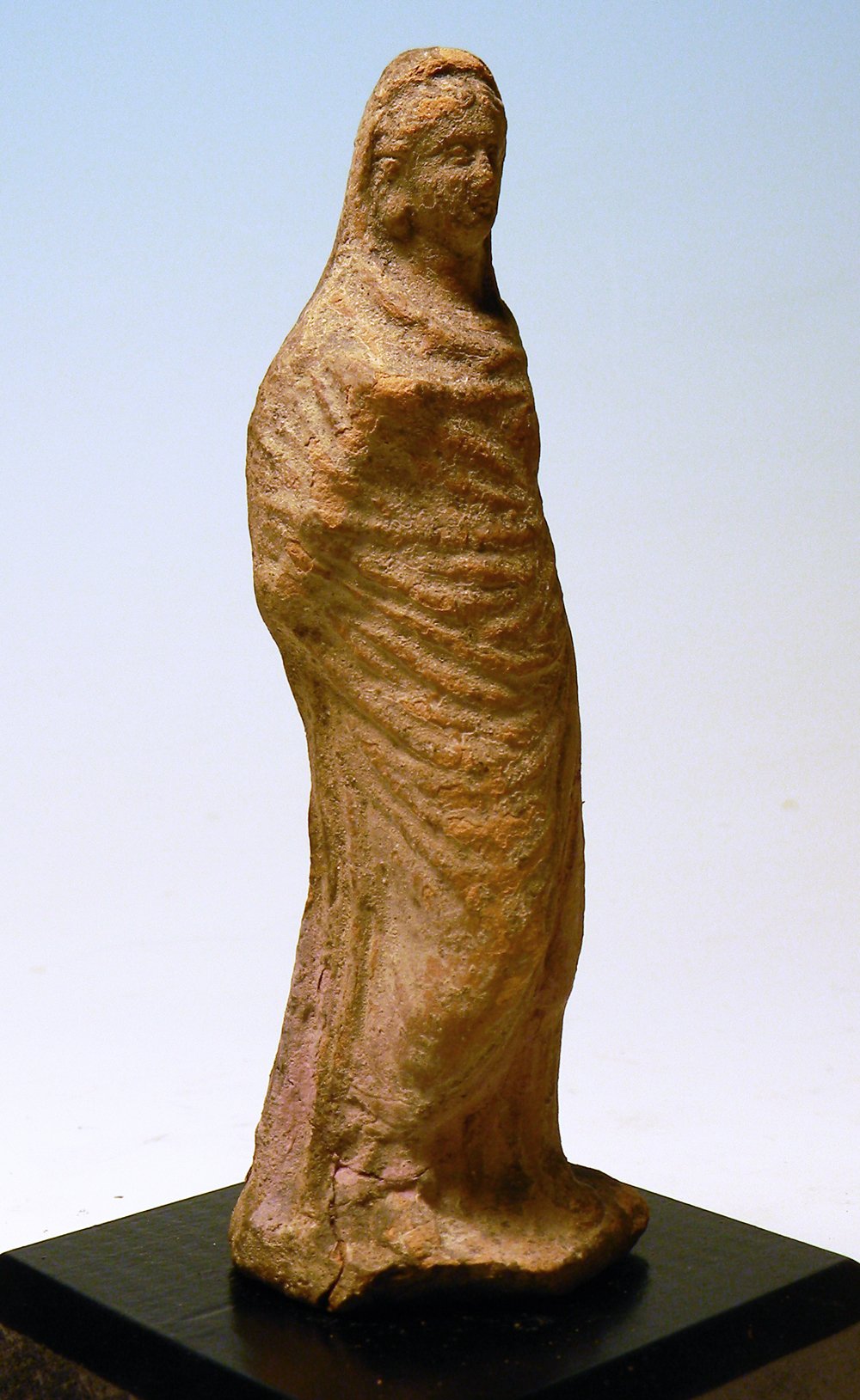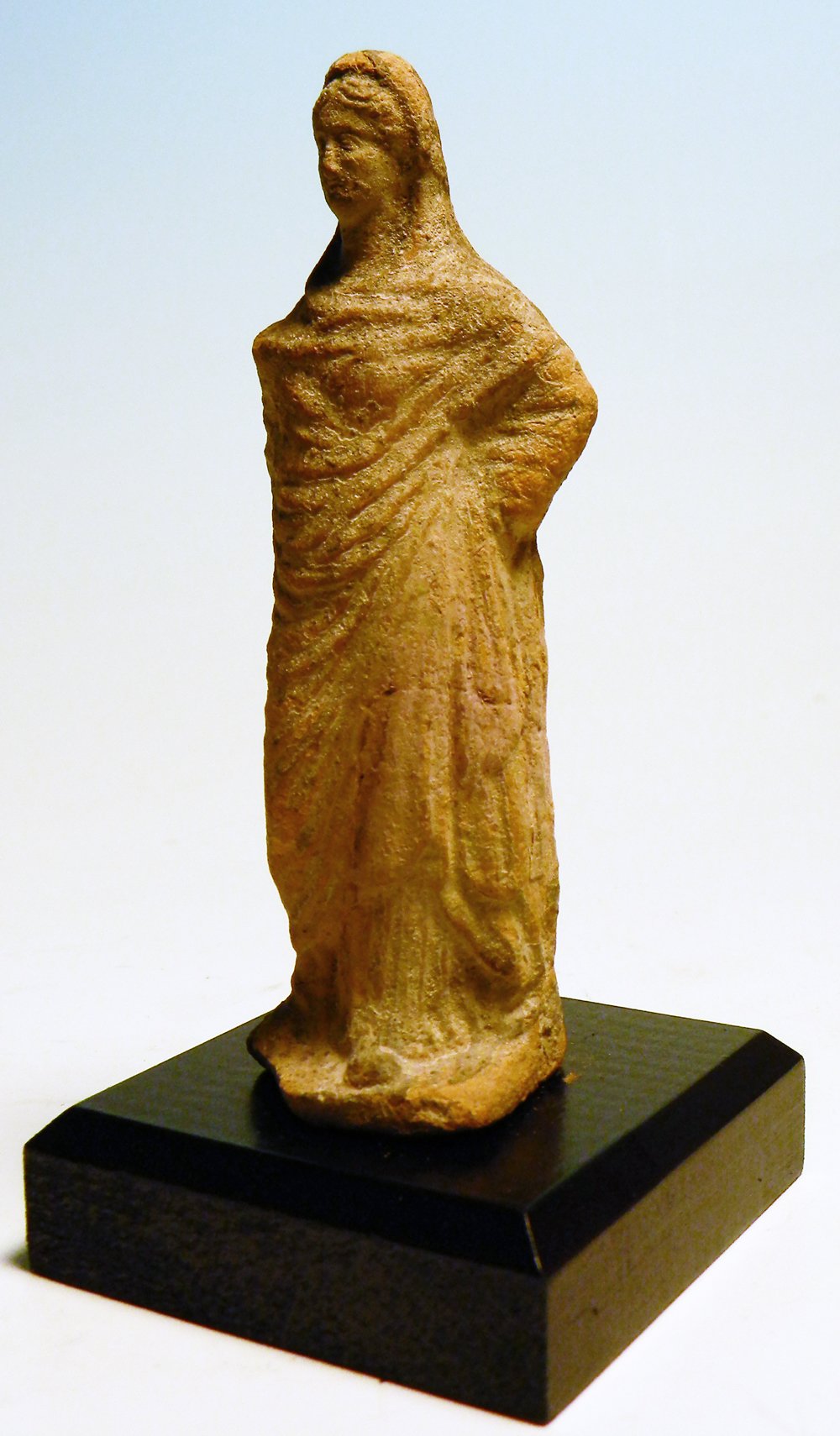 An ancient Hellenistic Greek terracotta statuette of a fashionable woman standing with her thick himation pulled up over her head and draped over a long chiton.