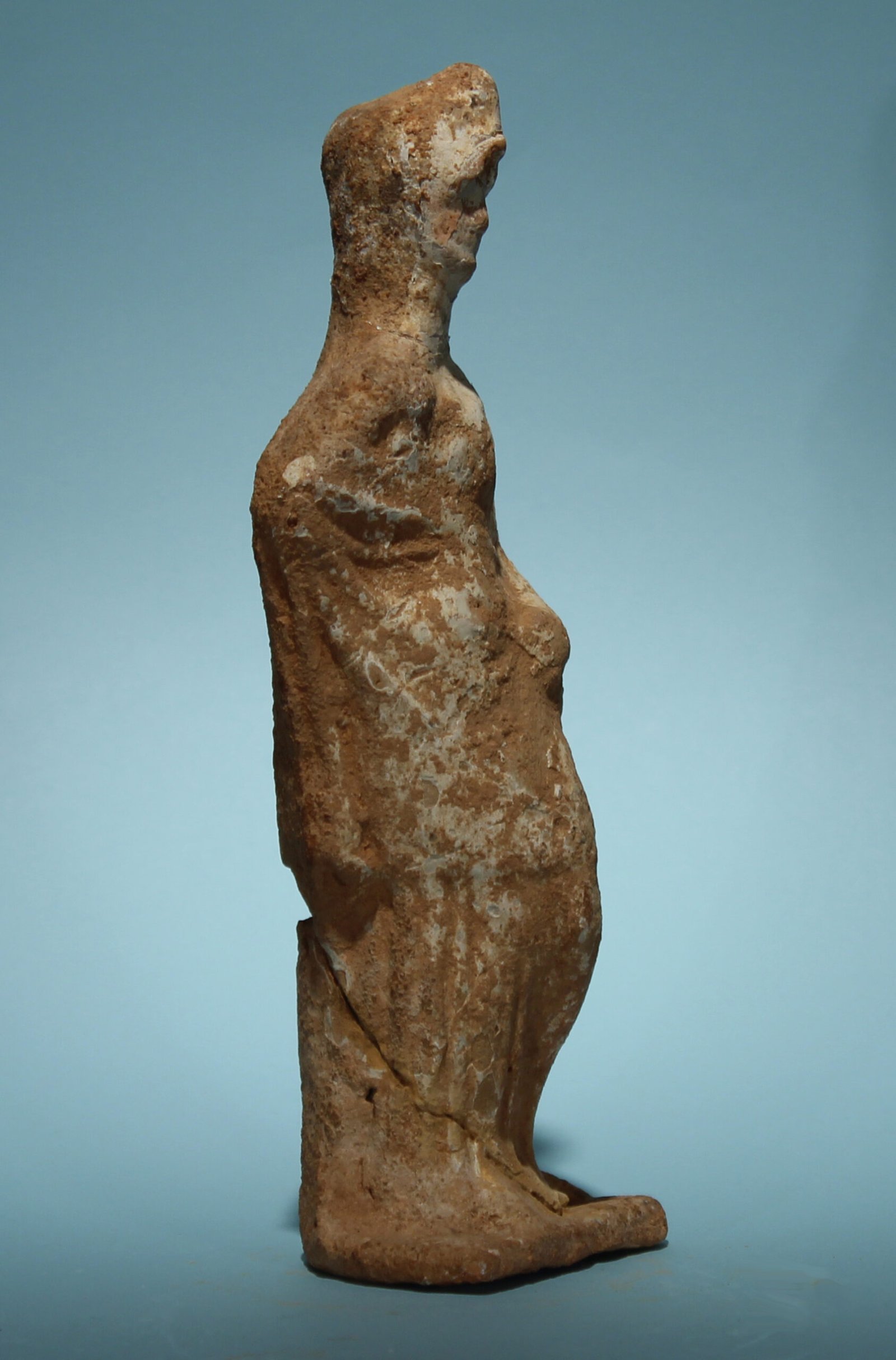 Terracotta statuettes depicting ancient Greek women in fine dress became especially popular during the Hellenistic period. Workshops at Tanagra in Boeotia, and at Rhodes, and Alexandria produced a great many finely modeled and painted examples of fashionable women.An undercoat of white survives over much of the figure, with traces of pink on the border of the himation. The veiled head is elongated at the top, perhaps to support a tholia (disk-like sunhat).
