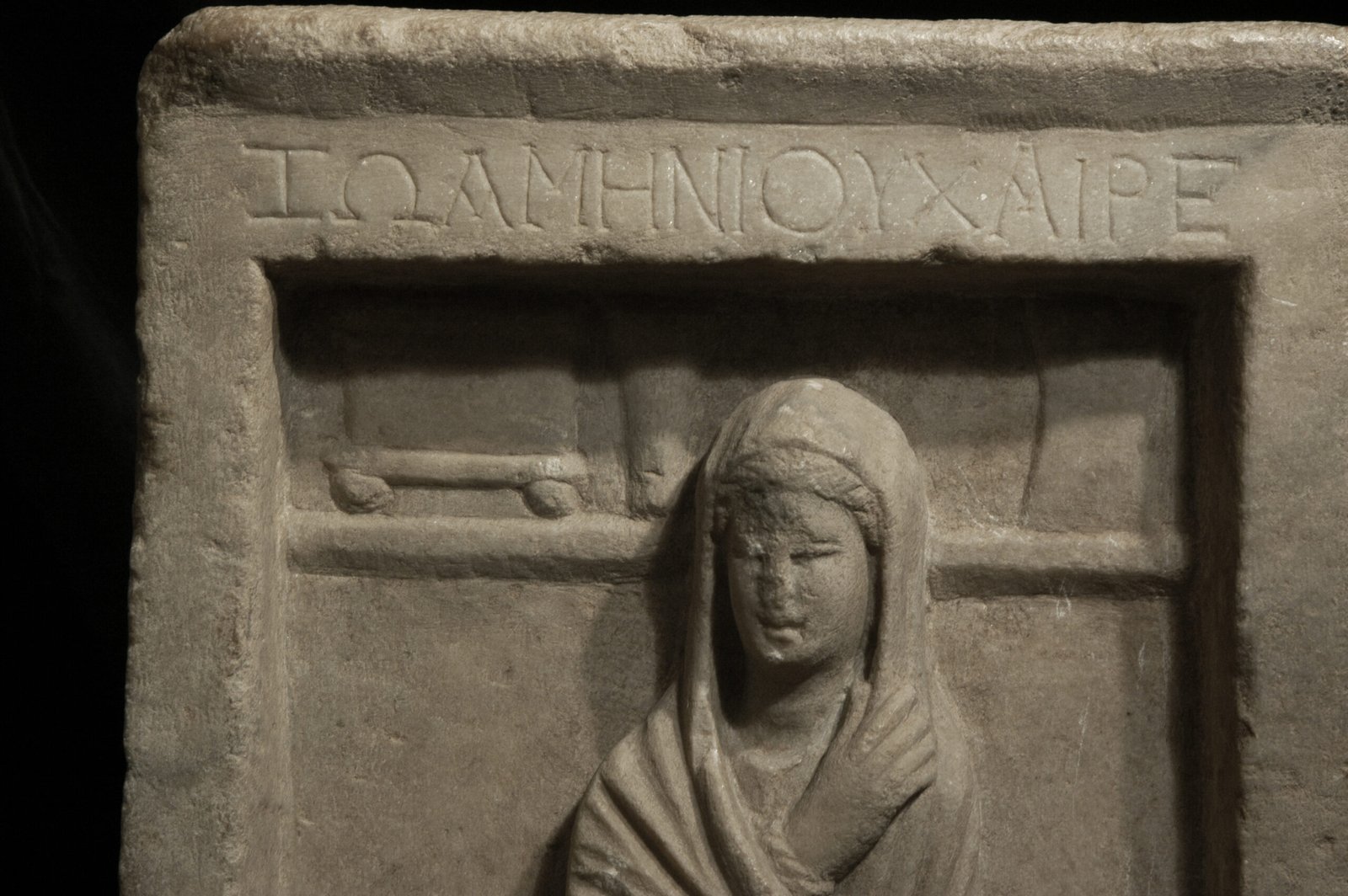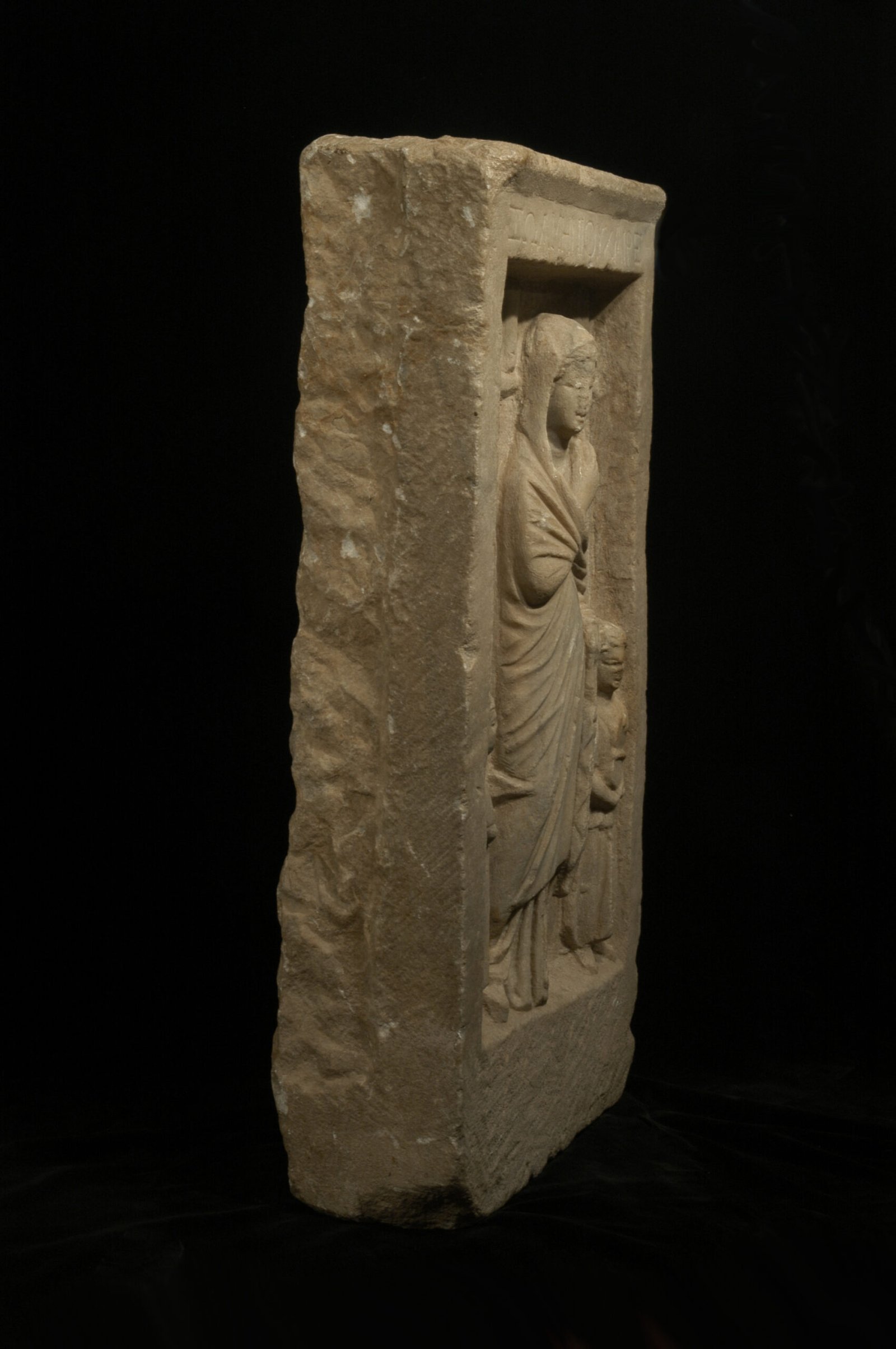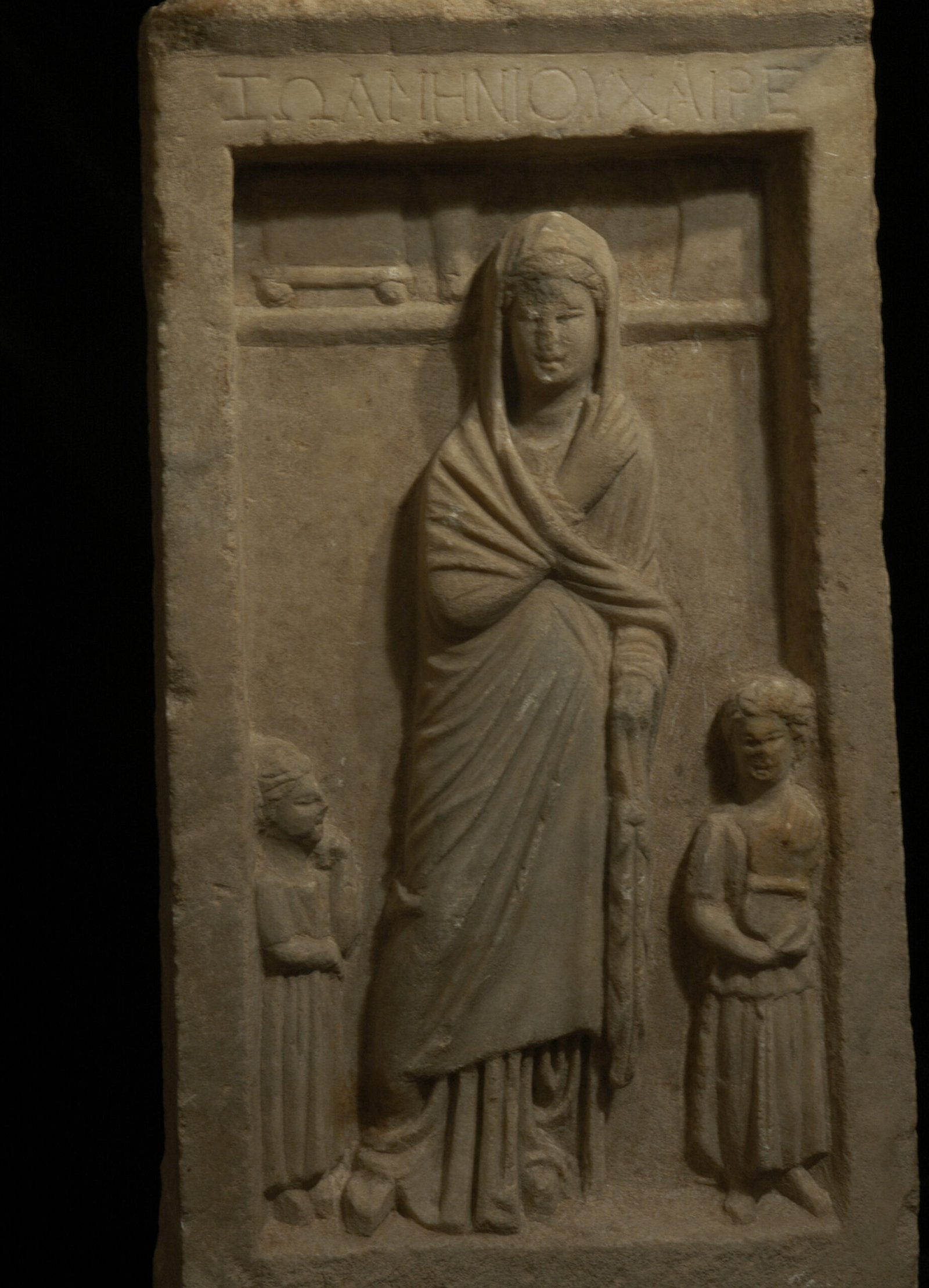 An ancient Hellenistic Greek marble stele depicting in relief a woman named Zoa, wearing a himation, standing in the center flanked by two small girls. Her himation covers head and body, leaving only a small section of the right arm and the richly pleated undergarment visible. The right hand grasps the hem of the himation. The girl to the left, shown in profile, is in a reflective pose, looking up with the fingers of her left hand to her neck. The girl to the right holds an open mirror in both hands. A box, a kalathos and a double comb stand on a ledge in the upper part of the relief. On the upper frame, an inscription reads: Zoa, daughter of Menios, farewell.