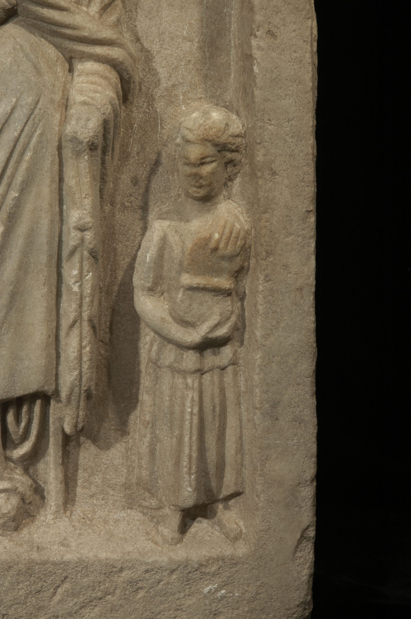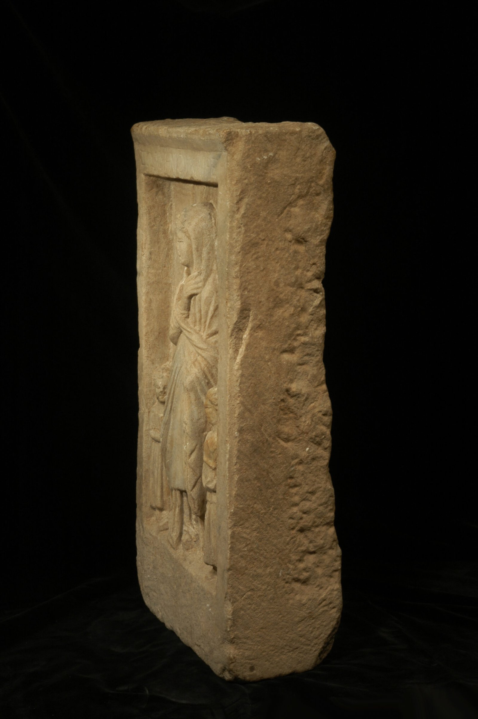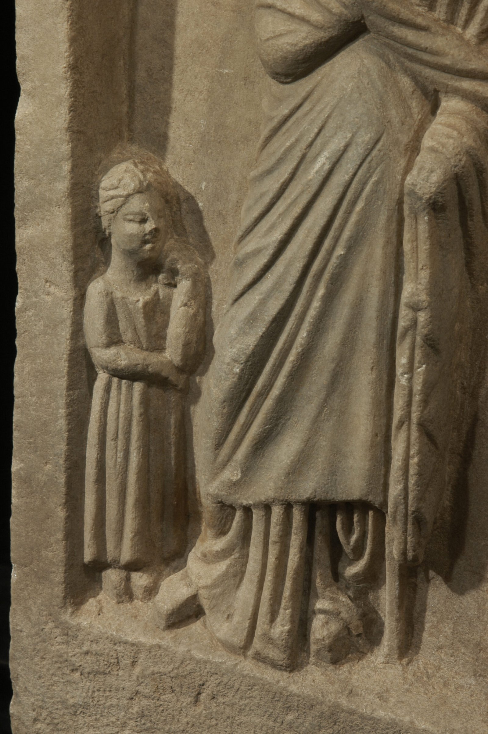An ancient Hellenistic Greek marble stele depicting in relief a woman named Zoa, wearing a himation, standing in the center flanked by two small girls. Her himation covers head and body, leaving only a small section of the right arm and the richly pleated undergarment visible. The right hand grasps the hem of the himation. The girl to the left, shown in profile, is in a reflective pose, looking up with the fingers of her left hand to her neck. The girl to the right holds an open mirror in both hands. A box, a kalathos and a double comb stand on a ledge in the upper part of the relief. On the upper frame, an inscription reads: Zoa, daughter of Menios, farewell.