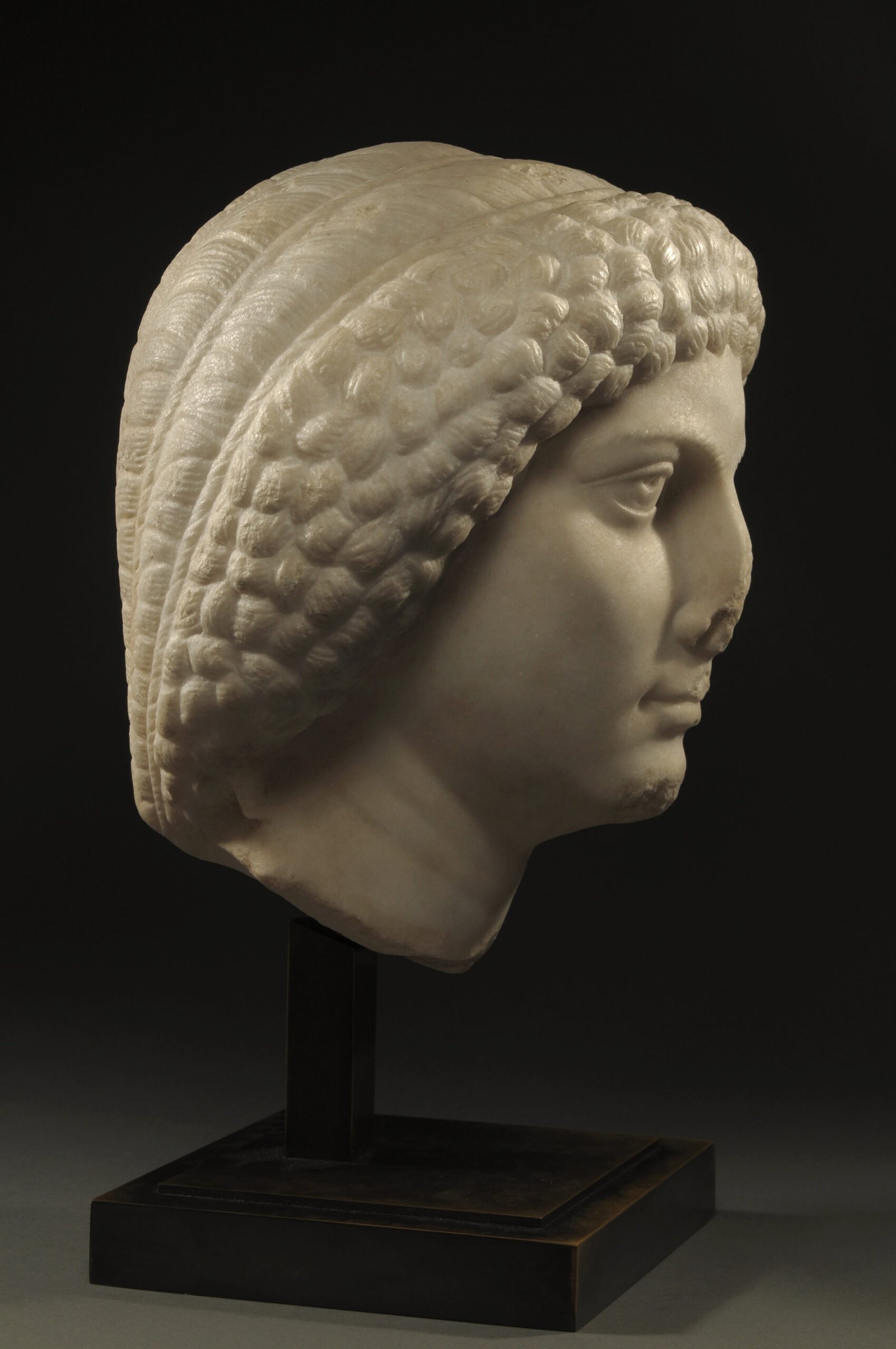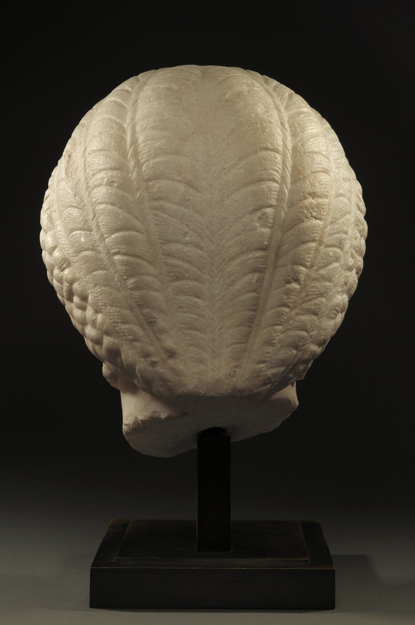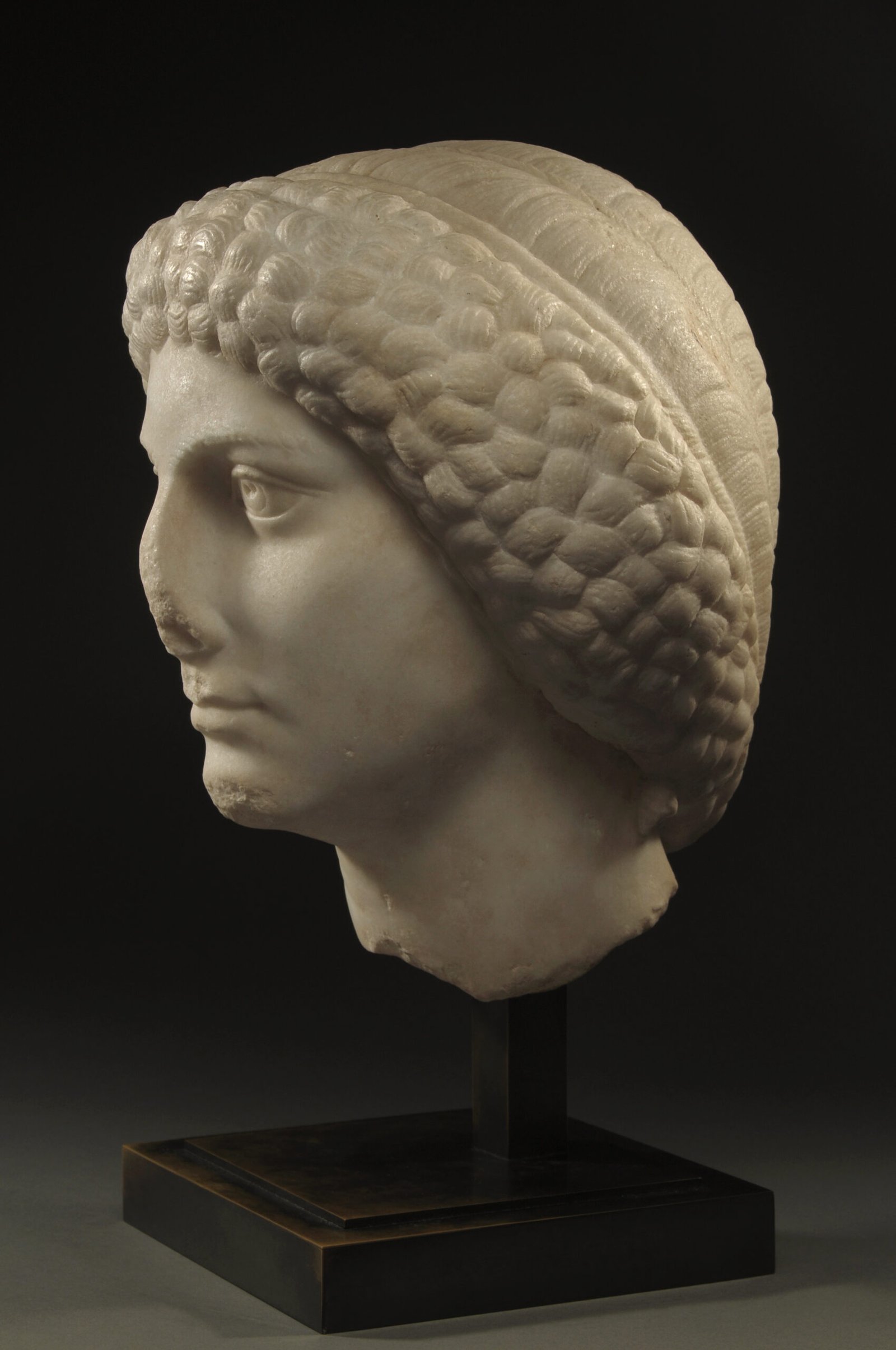 An ancient Roman marble portrait head of a Patrician woman with an elaborate coiffure of tiers of curled locks bound by braids in the back. Her expression is calm and dignified with wide set eyes, arching eyebrows and slight smile. She likely represents a daughter of an emperor of the Severan Dynasty.