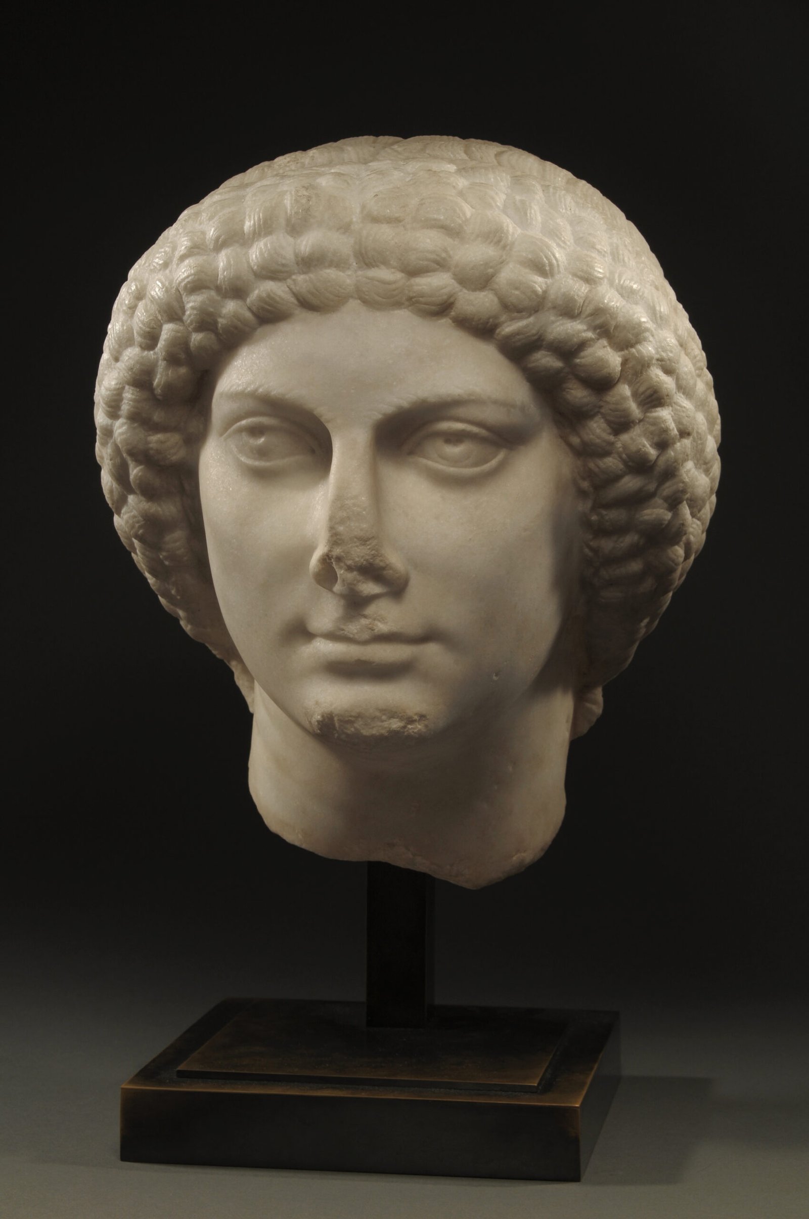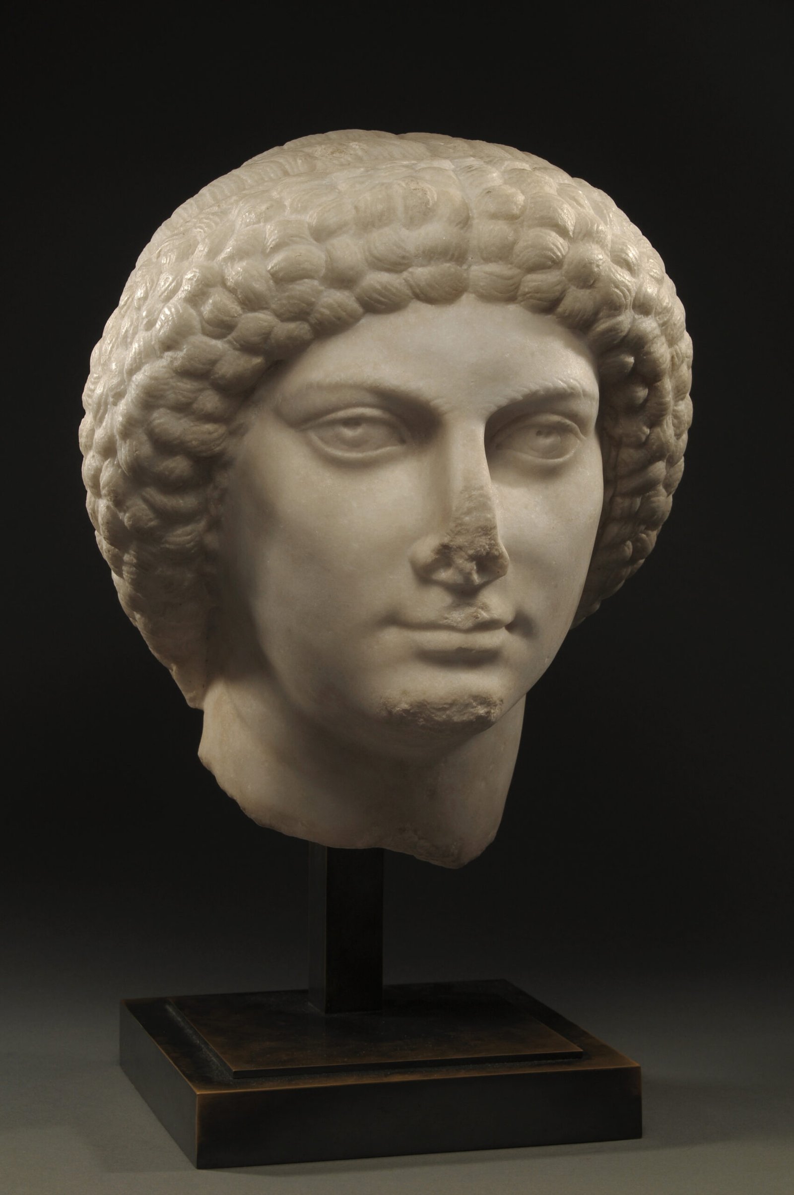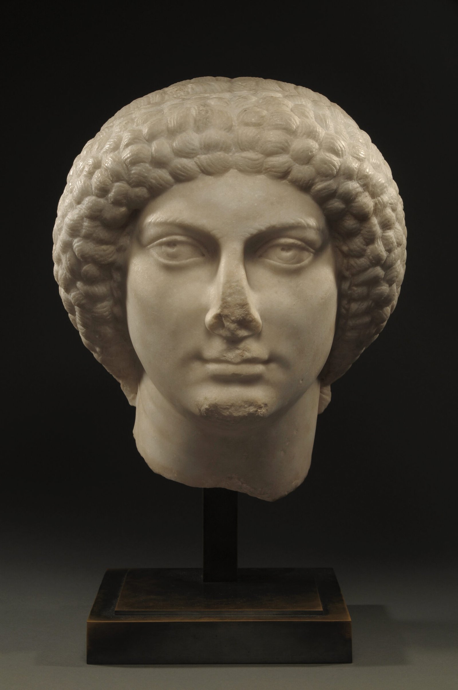 An ancient Roman marble portrait head of a Patrician woman with an elaborate coiffure of tiers of curled locks bound by braids in the back. Her expression is calm and dignified with wide set eyes, arching eyebrows and slight smile. She likely represents a daughter of an emperor of the Severan Dynasty.